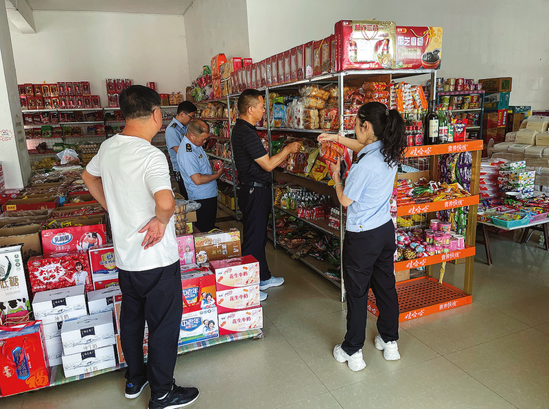 市監局執法人員在楊地鎮商店檢查食品保質期、儲存條件,筑牢安全防線。
