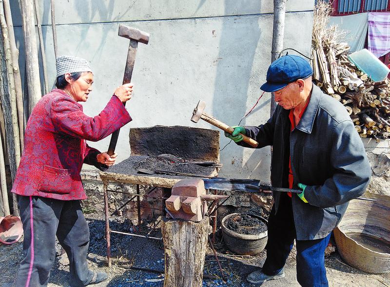 見到寇老時,他正和老伴打鐵。老夫妻倆手握鐵錘,你一下,我一下,富有節奏地打在燒得通紅的鐵板上,只見寇老左手用火鉗夾住燒得紅彤彤的鐵板,根據需要挪動著鐵板的位置,老伴任淑娥手持大鐵錘,他右手握著小鐵錘,交替著打鐵,打鐵的錚錚聲富有節奏,打破了山谷的寧靜。隨著老兩口反復的鍛打,一只镢頭已現出雛形。