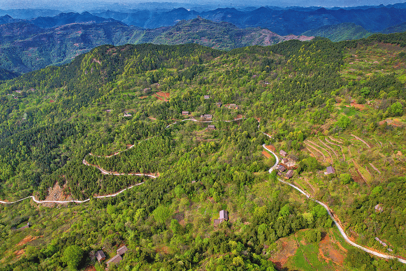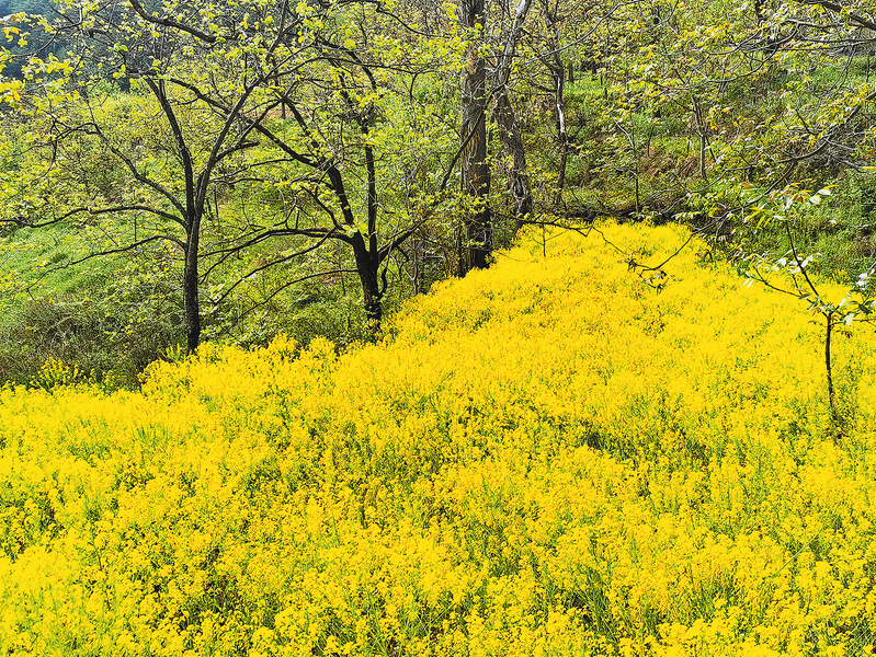 在老人的指引下,我們路過一片開滿金色花朵的地頭來到空山下邊,這里視野開闊,不時傳來鳥鳴與犬吠聲,山頂?shù)谋泵婧湍厦娣謩e坐落著兩個村莊。俯瞰山下,遠眺群山,仿佛置身于一幅寫意山水畫卷之中,愜意而逍遙。