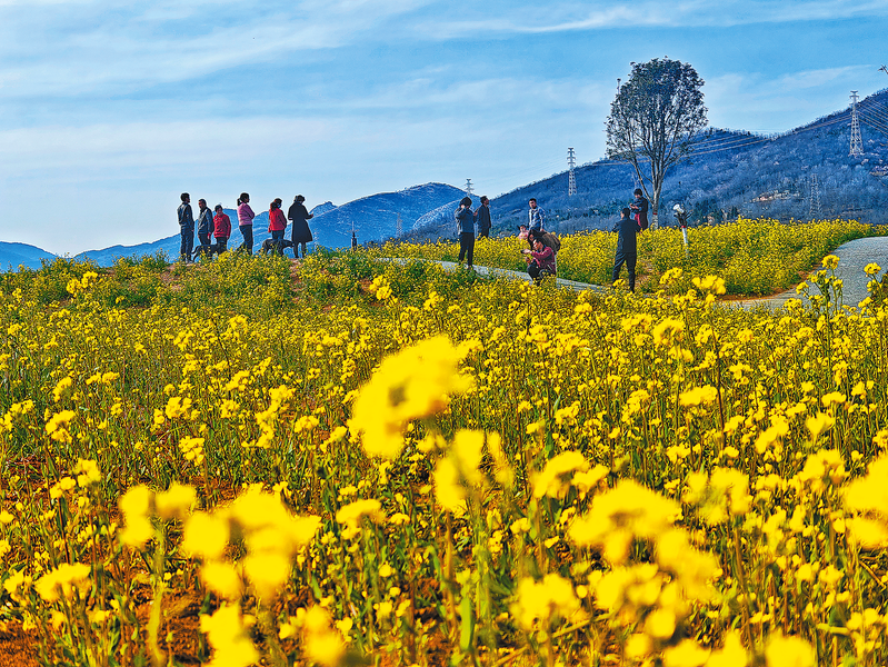近日,商州區文衛路與環北路丁字路口的文康園內,大片的油菜花次第盛開,為大地新添一抹金黃,吸引了不少游客前往踏青賞花,盡享春日美好時光。(本報記者 楊鑫 攝)