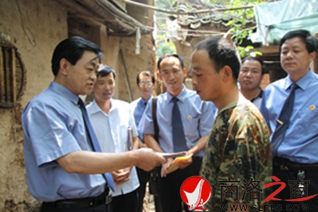 本網訊 6月29日,商州區檢察院干警深入扶貧點夜村鎮高橋村,為患有嚴重疾病的一組村民王葡萄及兒女捐款5000元。(陳昆山/攝)