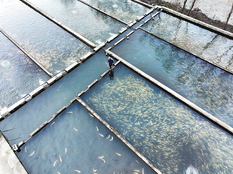 1月20日,在鎮安縣高峰鎮漁坪村,商洛寶東養殖有限公司的魚池里,密密麻麻的冷水魚歡快地游來游去,時不時有幾尾跳出水面。