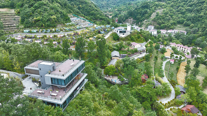 沿著豐收村的入戶路繼續往村子深處走,便來到了童話磨石溝景區。整個景區青山環繞,在創意民宿藝舍的屋頂能夠鳥瞰整個景區,五彩繽紛的童話屋創意民宿與蔚藍的天空相映成趣,遠處泳池的水一級一級地流下,形成了多層小瀑布,即便在盛夏,也能讓人頓時感到涼爽。