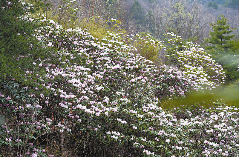 木王山國家森林公園景區坐擁西北連片面積最大的杜鵑花分布區,漫山遍野花團錦簇,猶如粉色云霞輕柔地飄浮在高山之巔。這片杜鵑花面積達千余畝,其中樹齡最長的已達271年,堪稱西北最大的原始杜鵑林帶,因而享有“千山杜鵑”的美譽。