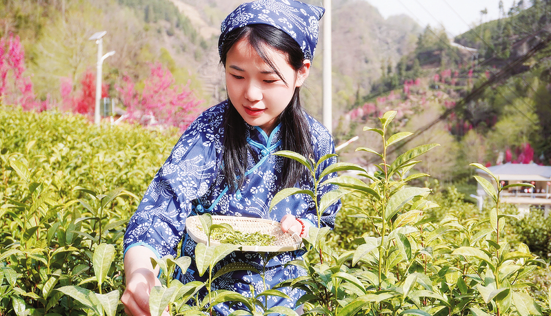 “二月天楊柳醉春煙,三月三來山青草漫漫,最美是人間四月天,一江春水綠如藍(lán)……”4月10日,鎮(zhèn)安縣達(dá)仁鎮(zhèn)象園村的茶山上,云霧繚繞。25歲的程芳穿梭在茶樹間,指尖拂過沾著清露的茶芽,嘴里輕輕哼唱的旋律,仿佛為這幅春日采茶圖配上了靈動的音符。誰能想到,眼前這個動作嫻熟的采茶姑娘,一年多前還是城市里的一名鋼琴教師。