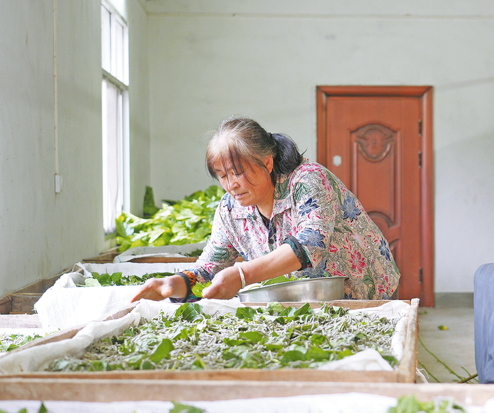 蒿坪村村民惠大珍在給小蠶喂桑葉