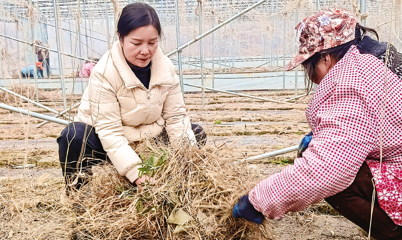 宋清潔(左)和群眾一起清理木耳大棚的雜草