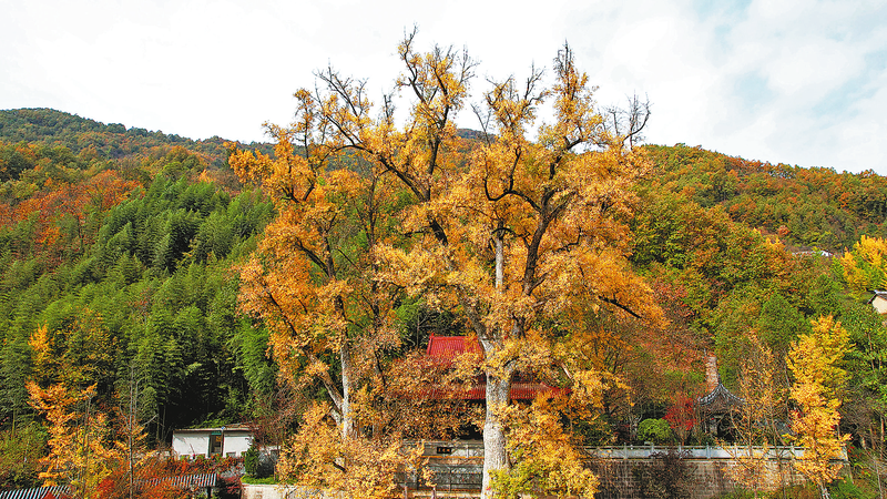 東甘溝銀杏園里,一雄一雌兩棵銀杏樹,相距7米,樹齡均1700多年,根系盤結,枝丫交錯。兩棵古樹樹高均超過40米,樹冠直徑30多米,并立的銀杏樹宛如一對耳語廝磨的情侶,故而稱其為“夫妻”銀杏樹。東甘溝也因“夫妻”銀杏樹,而成為遠近聞名的銀杏觀賞地。
