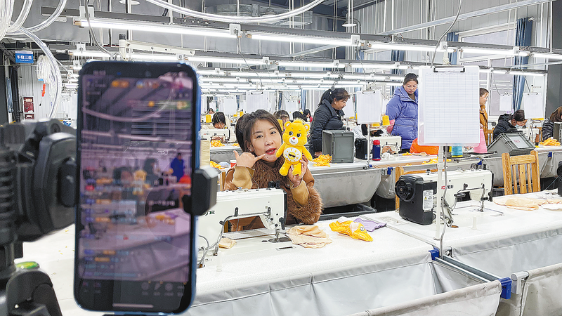 主播在柞水潤安毛絨玩具廠直播,向求職者介紹玩具廠的崗位信息。