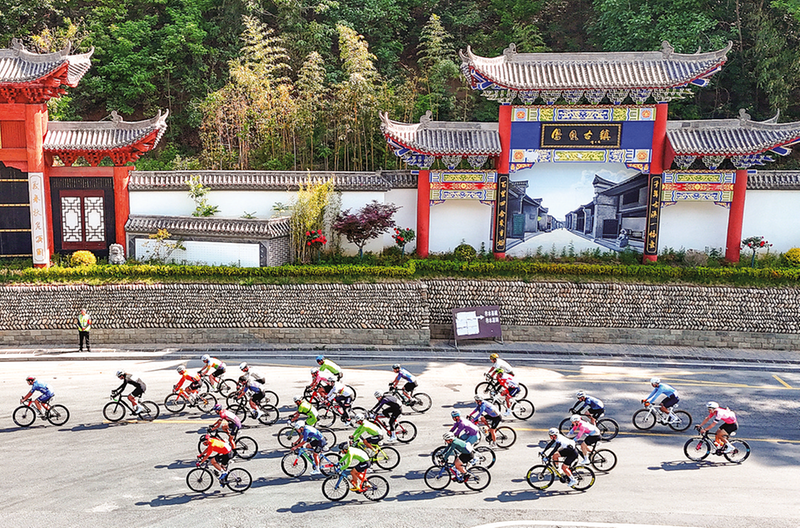 選手們騎行經過G211與營盤高速公路出口交會處的柞水景區微景觀集中宣傳展示區