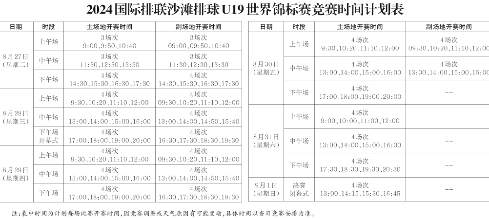 1.比賽主場地設(shè)在秦嶺博物館西廣場,副場地設(shè)在商州群眾運動公園沙灘排球場。比賽從8月27日開始至9月1日結(jié)束,共6個比賽日,每個比賽日從9:00至20:30,在主場地1塊賽場、副場地3塊賽場同時進(jìn)行比賽。開幕式8月28日20:30、閉幕式9月1日17:30在主場地舉行。